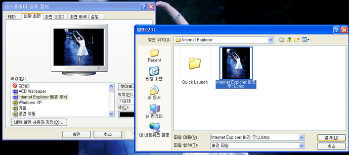 배경화면을 마우스 오른쪽으로 클릭해서 속성을 선택하면 뜨는 왼쪽 창에서 바탕화면을 선택합니다. 그런 뒤에 배경에서 그림을 선택하면 그 그림을 배경화면으로 넣을 수가 있는데요… 거기는 windows 디렉토리에 존재해야만 나타나므로…. 다른데 있는 그림을 선택하려면 찾아보기를 눌러서 선택해 줘야 합니다. 오른쪽 창이 찾아보기 선택해서 띄운 그림이죠. ^^