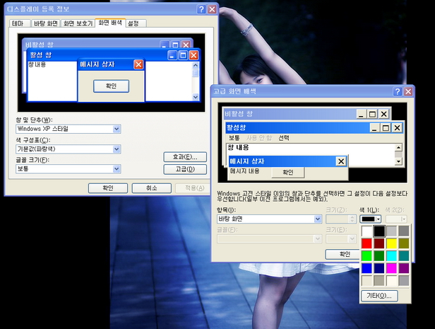 여기서 화면배색 텝을 선택하고…. 거기서 적용버튼의 위의 고급버튼을 클릭합니다.