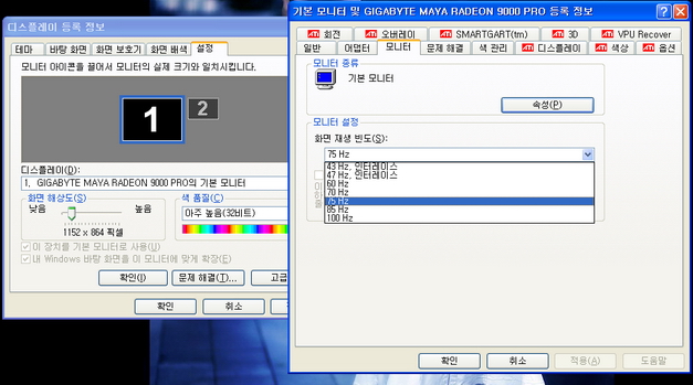 모니터 텝를 선택하셨으면 화면재생빈도를 바꿔야 하는데 CRT 모니터의 경우에는 75Hz를 선택해 줍니다. 좀 더 높은 것을 선택해도 되는데…. 이건 시스템이 받쳐줘야겠죠. ^^ 만약 75 Hz 설정이 없다면 왼쪽 창에 선택했던 해상도를 좀 작은 해상도로 설정합니다. 75 Hz의 수평주파수는 사람이 떨림을 느끼지 않는 최소한의 주파수라고 합니다. LCD의 경우는 CRT 모니터에 비해서 화면이 깜빡이지도 않고, 대응속도(화면이 변하는 속도)도 느려서 60Hz로 고정되어 사용하도록 되어있을 것입니다.