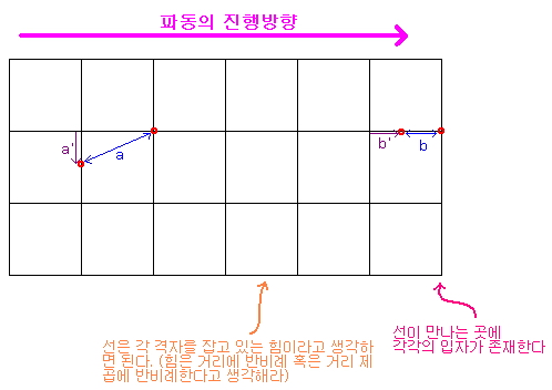 격자는 입자를 고정시키는 틀의 역할을 하는데, 입자 사이의 거리가 멀어지면 더 가까워지게 하려는 힘이 작용하고, 더 가까워지면 멀어지려는 힘이 작용하면서 틀의 모양을 유지하려 한다. 이때 입자 사이에 작용되는 힘의 특성은 여러 가지로 달라질 수 있겠지만 이 글에서는 간단하게 격자의 고정점에서 벗어난 거리에 비례한다(후크의 법칙을 만족한다)고 생각하자. 즉 윗 그림에서 a’와 b’의 길이에 비례하는 힘이 입자 사이에 작용된다는 것이다.