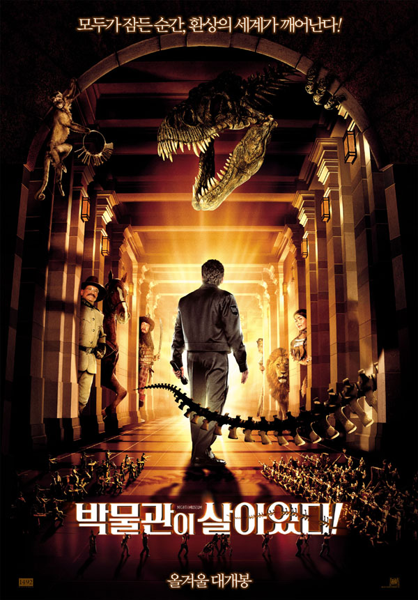영화의 시작은 좀 황당합니다. 배우들의 오버액션이 눈에 너무 띄고, 딱딱한 말투들… 마치 영어책을 읽는 초등학생같아 보이는 어설픈 연기는 이 영화가 1억5000만$나 들인 영화인가 하고 생각하게 합니다. 음.. 하지만 이 연기는 일부러 한 장치인듯 합니다. 초기 이야기 발단은 흔히 미국영화들이 사용하는 방법입니다. 이혼한 부부 사이에 아들이 하나 있고, 아버지는 아들을 보기 위해서는 아무거나 직장을 구해야 하죠. 그래서 괴상망측한 박물관의 야간경비를 서게 되고, 때려치우고 싶은데도 불구하고 계속 다니게 만들죠.
