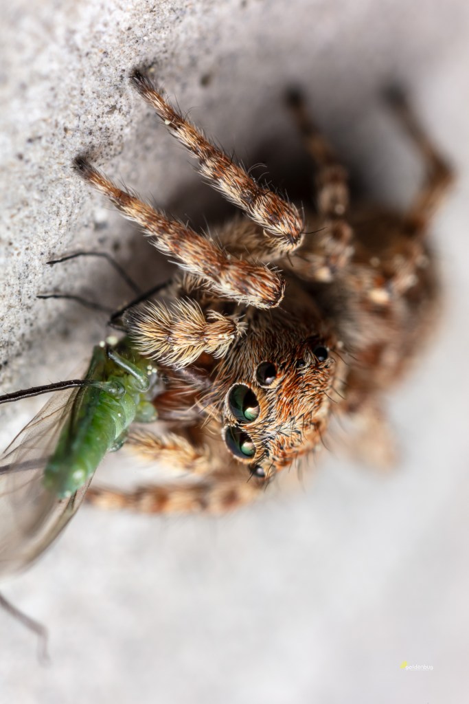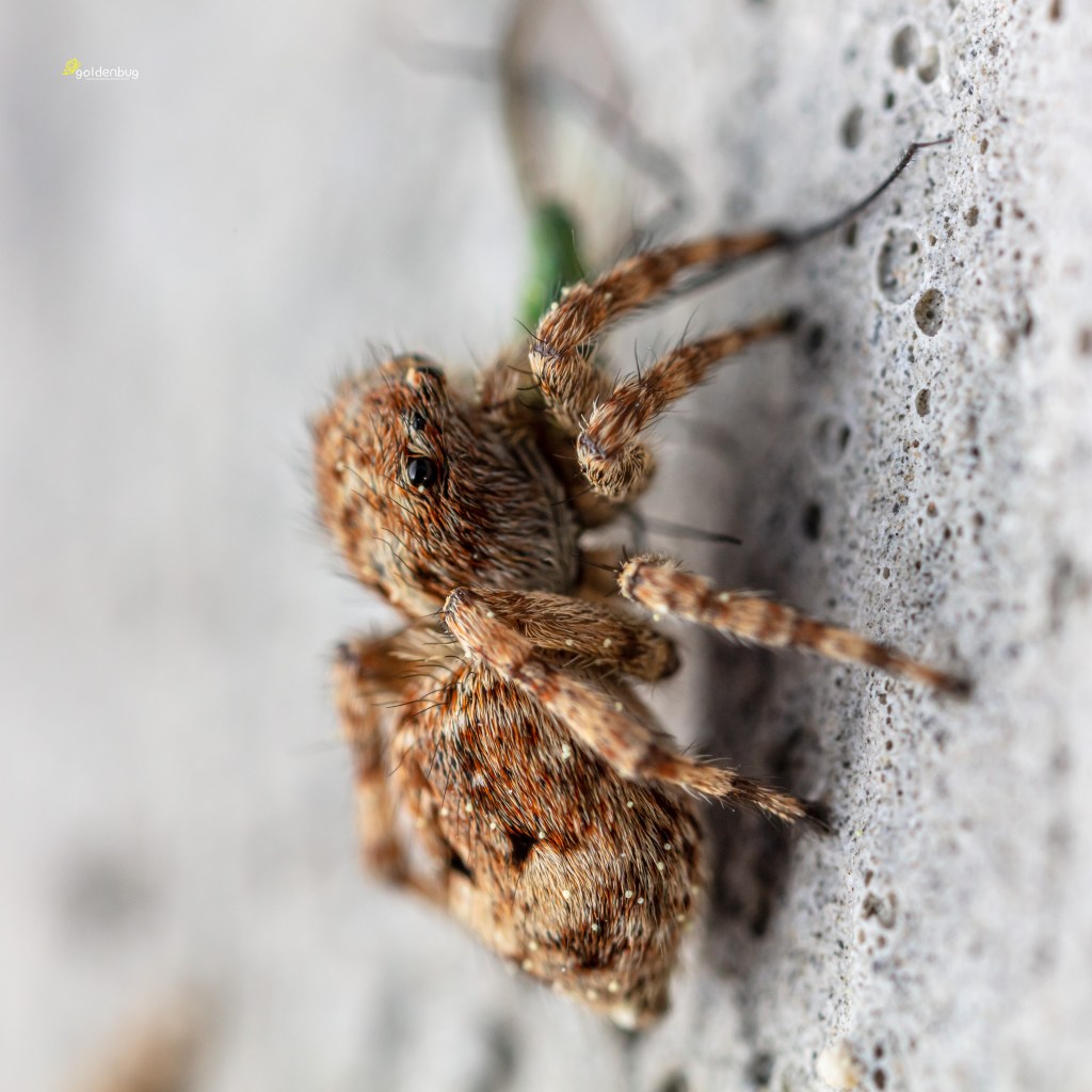 다른 깡충거미들처럼 사람에 대한 겁이 없다. 그저 호기심 어린 눈으로 살펴본다. 사진을 찍으며 플래시틀 터트려도 좀 귀찮아 할 뿐이다.