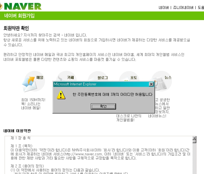 그런데 중요한 것은 제가 가입하고 현재 사용하고 있는 goldenbug는 2002년도 당시에 어떻게 가입됐느냐 하는 것입니다. (이건 분명 제가 직접 가입한 것입니다.) 저것이 가입될 때 이미 내 아이디가 3개가 존재한다면 가입불가 창이 바로 위에서처럼 떴어야 했을겁니다.