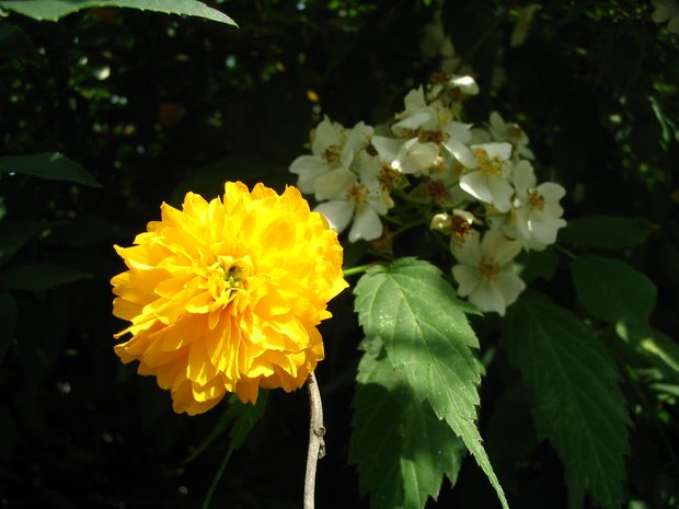 황매화입니다. 나무가 너무 약하고, 중앙이 비어있어서 잘 부러지는 편입니다. (근데 물리학적 원리상 가벼운 가지 치고는 가운데가 비어있기 때문에 더 강도가 높은 편입니다.)