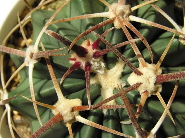 가시는 가시자리를 기준으로 생장점을 12시 방향으로 볼때 가장 긴 주변가시가 11시방향과 1시방향을 향해야 한다. 윗 사진의 능파는 아직 어리기에 이 두 방향으로 난 가시가 갖춰진것도 있고(3시방향의 가시자리) 아직 못 가춰진 것도 있다.(7시방향의 가시자리) 9시방향의 가시자리는 이 두개의 가시가 갖춰지기 막 시작될때 나타난 첨자가시이다.