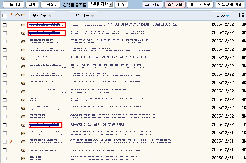 이 그림은 21~22일 사이에 나에게 온 스펨메일들의 목록이다. 이 그림에서는 지웠지만 나의 이메일 계정으로 나에게 스펨메일을 보낸 것이 3건이다. 이것 이외에도 분명 다른 정상적인 사용자들의 이메일로 온 스펨들이 잔뜩 들어있다. 아마 스펨업자가 새로운 정책을 들고 나온듯 하다.