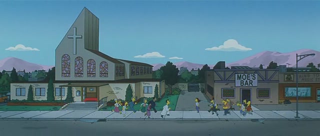 캡쳐 장면을 유심히 보면, 오른쪽 술집(MOE’S BAR)에서 술을 마시던 사람들은 교회로 뛰어가고, 교회에서 예배보고 있던 사람들은 술집으로 뛰어가는 모습을 발견할 수 있다. 이런 부분은 문화도 어느정도 알아야 하고, 많은 생각을 해야 재미있는 장면이다. 그래서인지, 시시회에서는 거의 모든 관람객들이 이 장면에서 웃었지만, 일반관람에선 단 한 명도 웃지 않았다. (웃으려고 준비하던 내가 뻘쭘해졌다.)