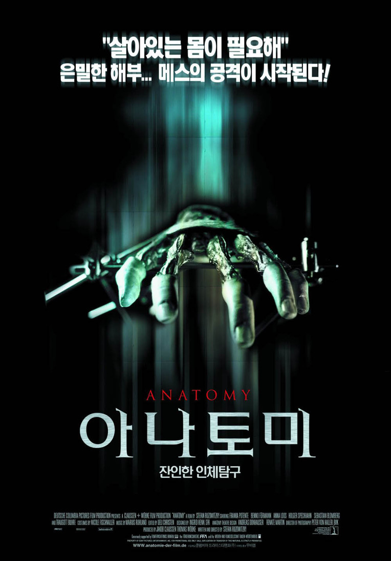 [아나토미]Anatomy는 독일에서 개발한 인체 표본화 기술에 대한 영화다. 실제로 이 기술을 이용해서 ‘인체의 신비전’에 전시된 전시물을 만들었다고 한다. 그 기술을 이용해 범죄를 저지른다면 어떨까? 그게 이 영화의 주제다. 이 영화는 개봉했던 2000 년 당시에는 꽤 이슈가 됐었다. 나는 당시에 자막을 만드는 방법으로 글쓰기를 공부하고 있었기에, 이 영화도 자막을 손 본 기억이 난다. 자막을 만들려면 영화를 몇 번씩 자세히 봐야 했다.