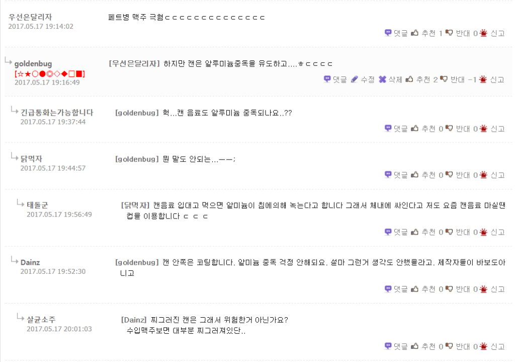 예전에 딴지일보 자유게시판에서 알루미늄캔의 유용성에 대해 올라온 포스트가 있길래, 댓글에 ‘하지만 캔은 알루미늄중독을 유도하고….ㅎㄷㄷㄷ’라고 댓글을 단 적이 있었다. 그랬더니…. 아래와 같은 답글이 달렸다.