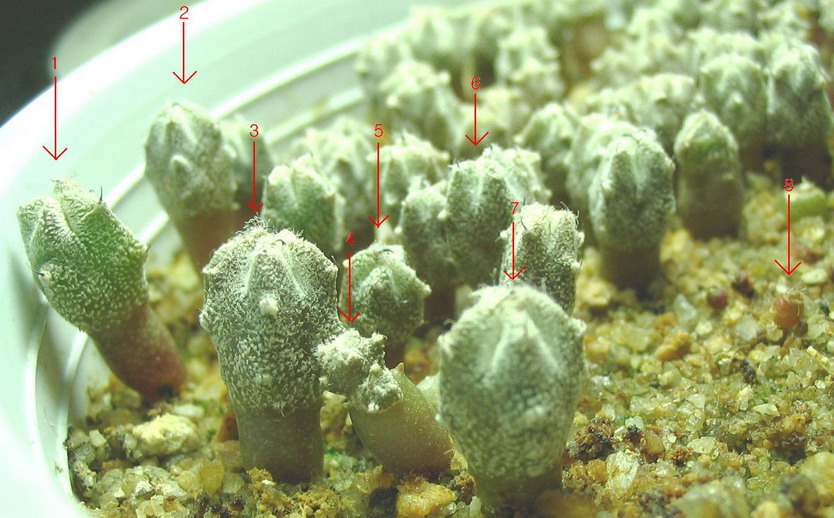 8번은 미니마라는 선인장의 싹인데 상황이 몹시 안 좋다. 300여개의 씨앗을 받아서 다 나눠주고, 60여개를 파종해 얻은 댓개의 싹 중에서 이 녀석 하나만 남았다. 8번의 왼쪽 위로 말라 죽어가는 미니마 싹이 두개 더 보이는데 저정도면 죽었다고 봐야 한다.