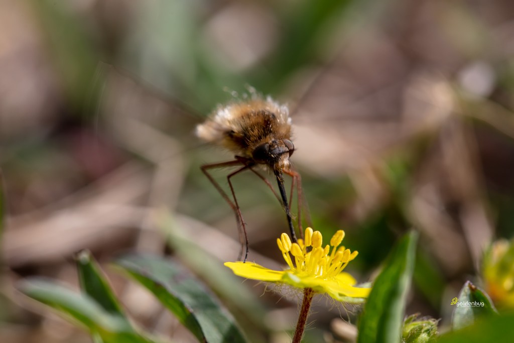 햇빛만으로 촬영하였는데, 양지꽃은 안 흔들렸지만, 빌로오드재니등에는 흔들렸다.