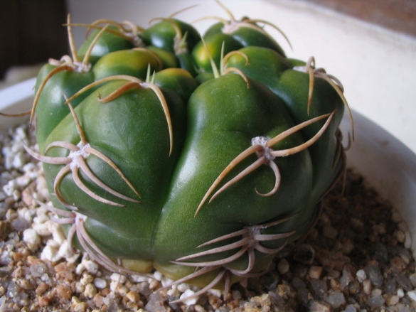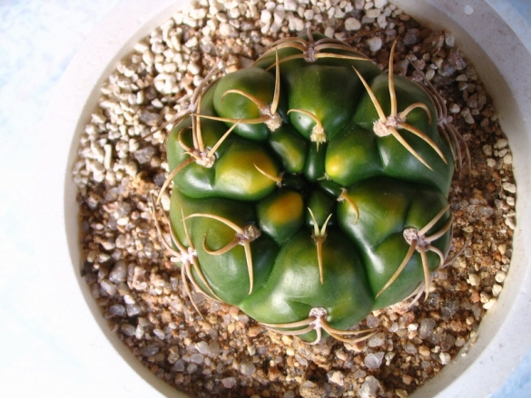 물을 충분히 주지 않으면 몸체가 심하게 쪼그라들며 몸체가 각이 져 보인다. 그래도 성장에는 지장이 없다. 물을 충분히 주면 사진처럼 둥글둥글하게 보인다.